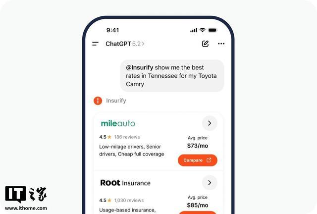 据IT之家了解,用户无需在多个页面间点击跳转,只需与应用对话即可。鉴于 ChatGPT 在全球已有数亿用户,Insurify 认为这种方式能让选购保险的过程更轻松、更贴近用户习惯。