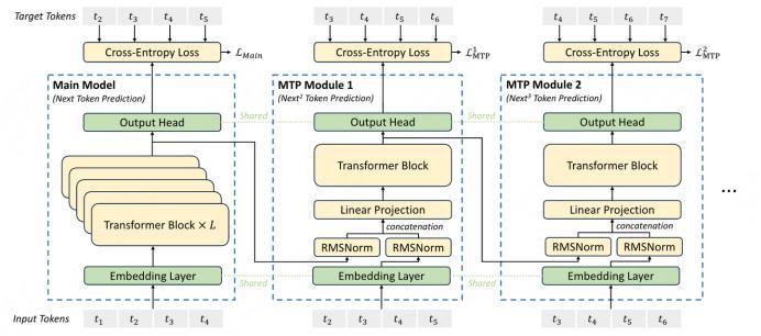 MTP则允许模型在前向计算中一次预测多个连续的词,以此减少迭代次数并提升计算效率。