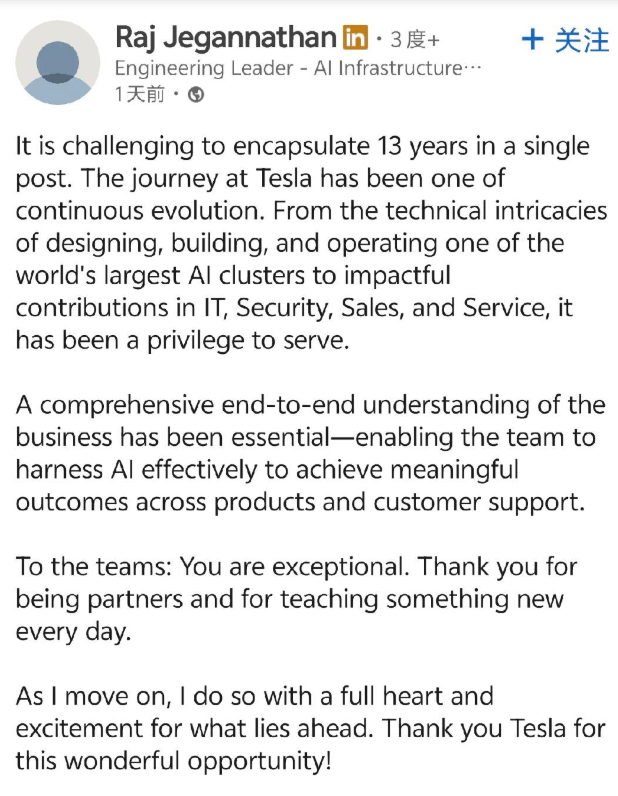 一边是特斯拉13年老将、负责AI Infra的副总裁拉杰·杰根纳坦(Raj Jegannathan)官宣离职。