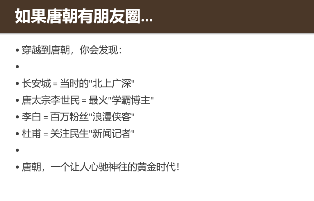 PPT制作环节,我们要求PPT“让学生真的能听进去”,举的例子能让他们产生共鸣,对于这一需求,模型在PPT制作中用了很多“比喻”,融入了一些当代元素,比如“唐朝朋友圈”、将长安城比作“北上广深”、将杜甫比作关注民生的“新闻记者”。
