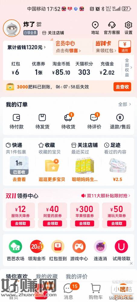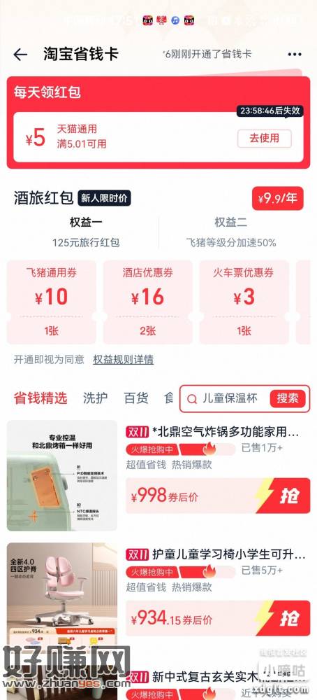 淘宝省钱卡点进去 领5元点淘或者天猫红包 5.01-5 可撸各种实物