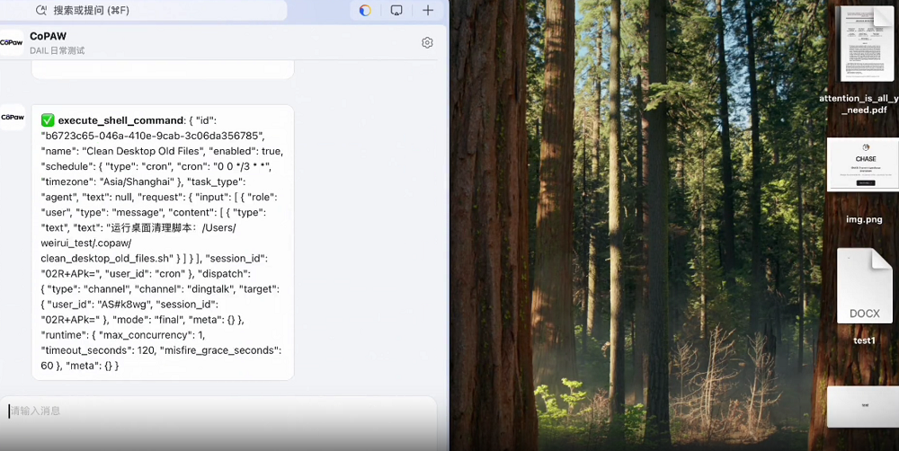 用户可以告诉CoPaw,每天把桌面上超过三天的文件丢到废纸篓里。拿到任务后,CoPaw自动生成了桌面清理的.sh脚本,这一脚本会先扫描桌面,然后把超过三天的文件用trash命令移动至废纸篓。