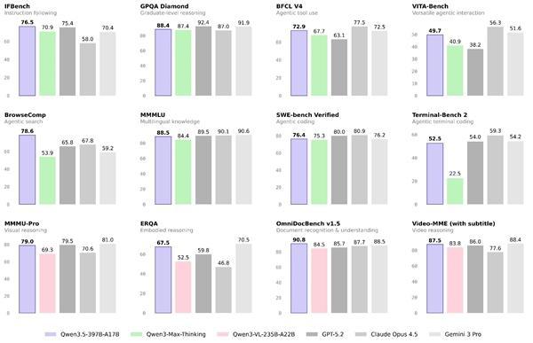 据介绍,千问3.5在MMLU-Pro认知能力评测中得分87.8分,超越GPT-5.2;在博士级难题GPQA测评中斩获88.4分,高于Claude 4.5;在指令遵循IFBench以76.5分刷新所有模型纪录。