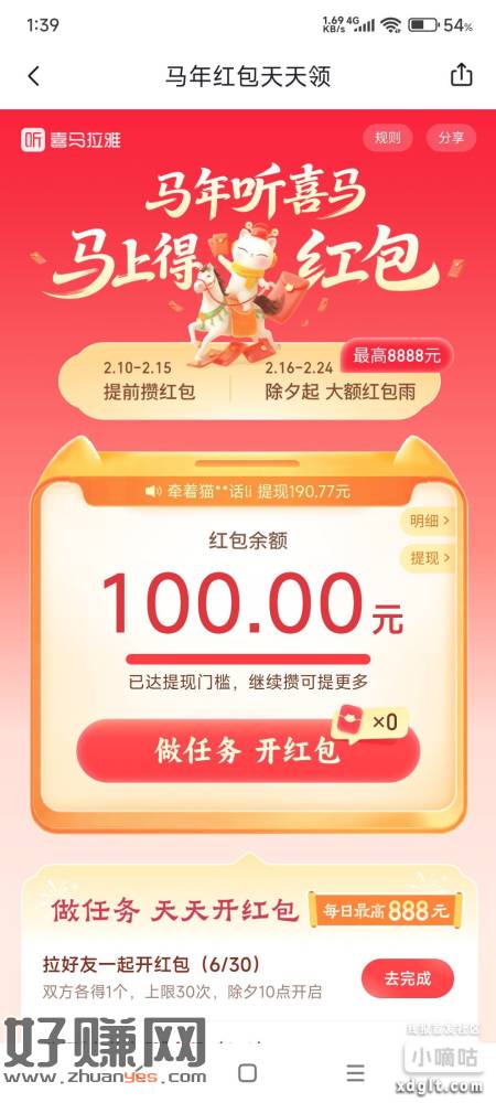 喜马拉雅成了 这几天的红包雨一次没落下 刚才差七毛钱听书五分钟给的开红包的机会直接给了七毛 提现秒到 舒服了