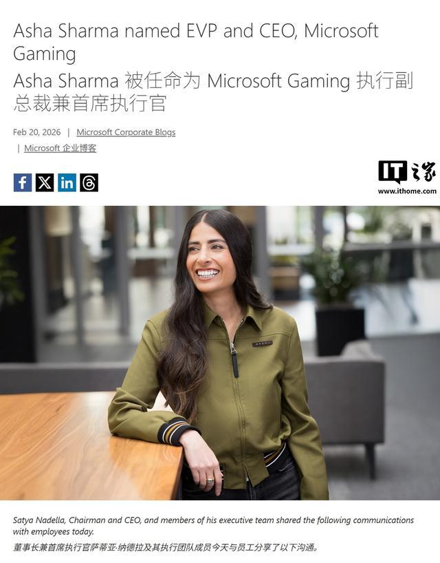 微软游戏业务迎来史诗级人事巨震,掌舵该业务长达 12 年、效力公司近 40 年的传奇人物菲尔 · 斯宾塞(Phil Spencer)宣布退休。而 Asha Sharma 将接替 Phil Spencer 出任微软游戏新任 CEO。她此前担任微软 CoreAI 产品总裁,并于 2024 年重返微软后深度参与 AI 平台建设。详情可见IT之家此前报道:
