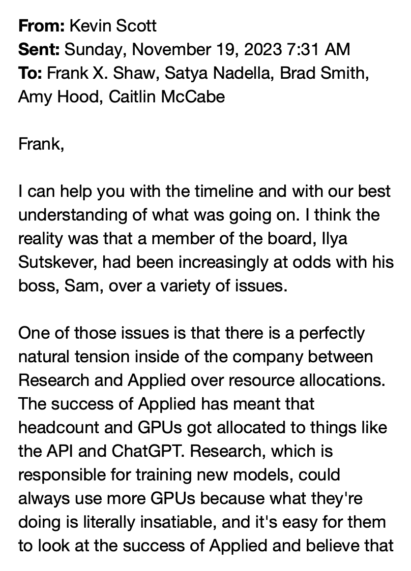 2023年11月,微软首席技术官Kevin Scott向CEO纳德拉汇报时如此剖析局势: