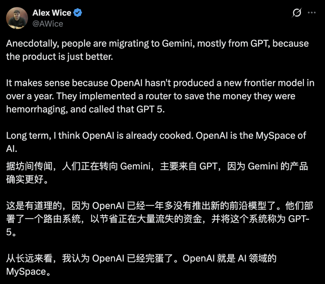 还有网友指出OpenAI已经一年多没有推出新的前沿模型了,ChatGPT的用户正在转向Gemini,从长远看OpenAI已经失去竞争力。