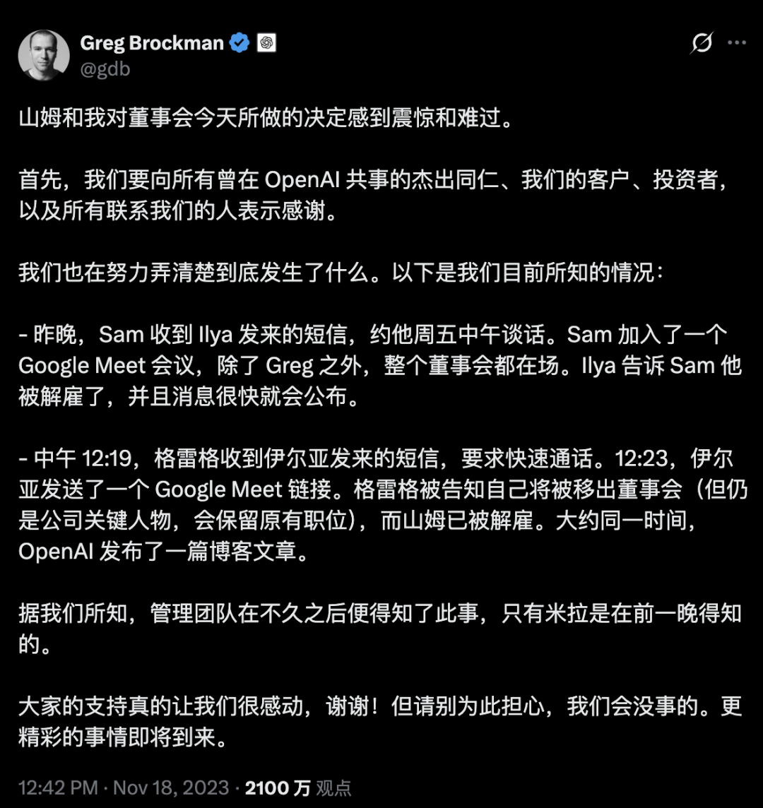 于是,2023年11月17日,OpenAI董事会传出了一场震惊科技界的重磅炸弹: