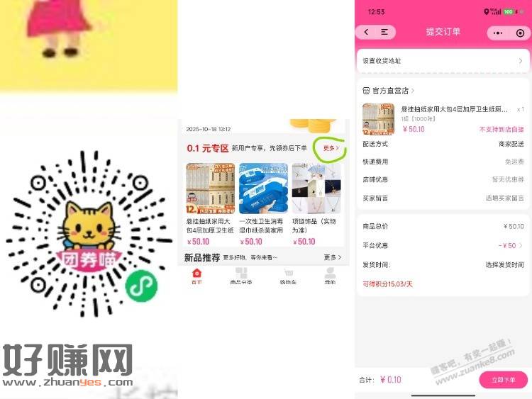 扫码进入,点我的去登录,然后首页点更多进入领券,0.1拍纸巾,多号多撸现在库存还多