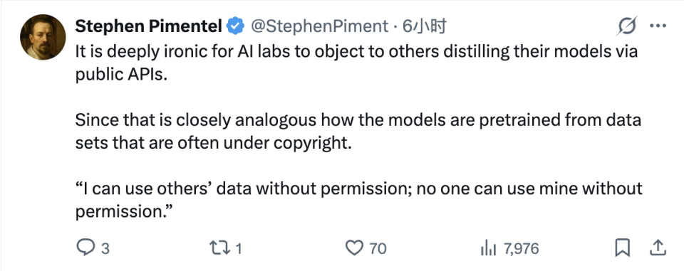 「我不敢相信有人会这样偷 Anthropic 的东西。要知道 Anthropic 可是花了数百万工时亲手写代码、写文章、画画、写书来生成训练数据的啊。请尊重知识产权!」