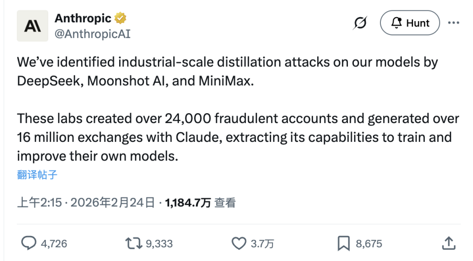 DeepSeek、Moonshot AI(月之暗面)和 MiniMax 对 Claude 发起了工业级蒸馏攻击,用超过 24,000 个虚假账号,跟 Claude 进行了超过 1600 万次对话,目的是抽取 Claude 的能力来训练自家模型。