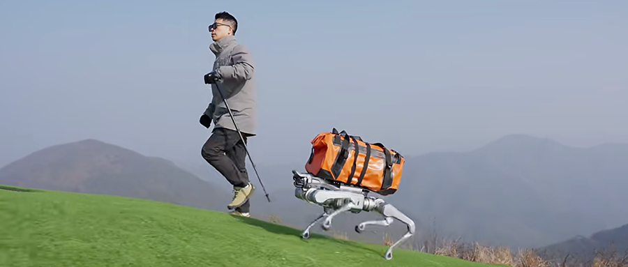 在视频一开头,Unitree As2从车上一跃而下,跟随一位男士开始跑步,显示出这款产品类似于消费级四足机器人的轻量化体格,字幕“徒步伙伴”也展现出其可以用于运动陪伴场景。