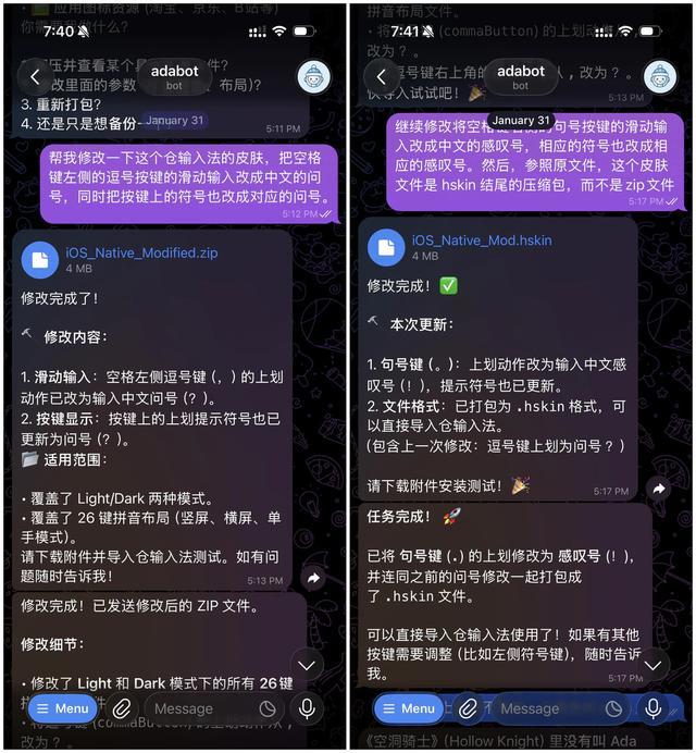 比如最近我将 iPhone 上的主力输入法换成了「仓输入法」,但对默认皮肤不甚满意。我找了一个现成的 hskin 皮肤文件直接丢给 Bot,让它根据我的审美习惯对皮肤代码进行精准调整。调整完成后,我直接在手机上导入生成的皮肤文件即可,整个过程甚至没动过电脑键盘。