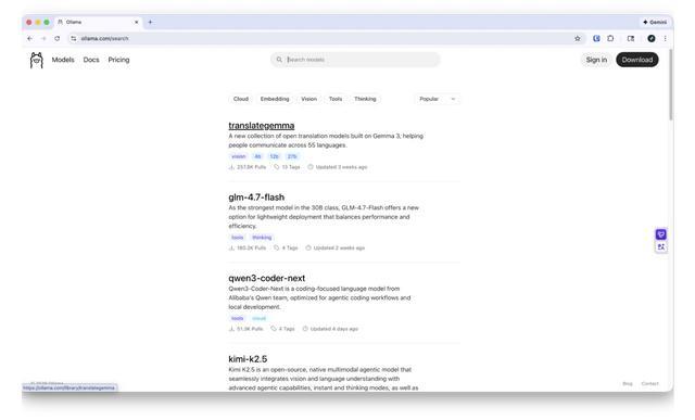 如果你非常注重个人隐私,或者自己的设备性能强大,那么使用本地模型也是一个不错的选择。你可以通过 Ollama 服务来安装一些本地 AI 大模型,比如说 DeepSeek V3.2、qwen3-coder-next、gemma3 等,然后在 OpenClaw 中选择调用 Ollama 本地模型,这样能省下一笔不菲的费用。