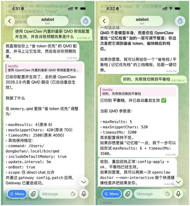 第二个方式,是启用 OpenClaw 内置的 QMD。这个服务提供了一个记忆检索中间层的作用,它可以在每轮对话前,先从历史记忆里挑选最相关的片段,再把这些片段注入给模型,帮助 OpenClaw 在记住长期上下文的同时控制 Token 成本。你可以直接让 OpenClaw 帮你启用 QMD,同时根据平衡、节省、性能三个不同的档位来调整每次最多记忆条数、每条记忆截断数量、检索超时时长等参数。