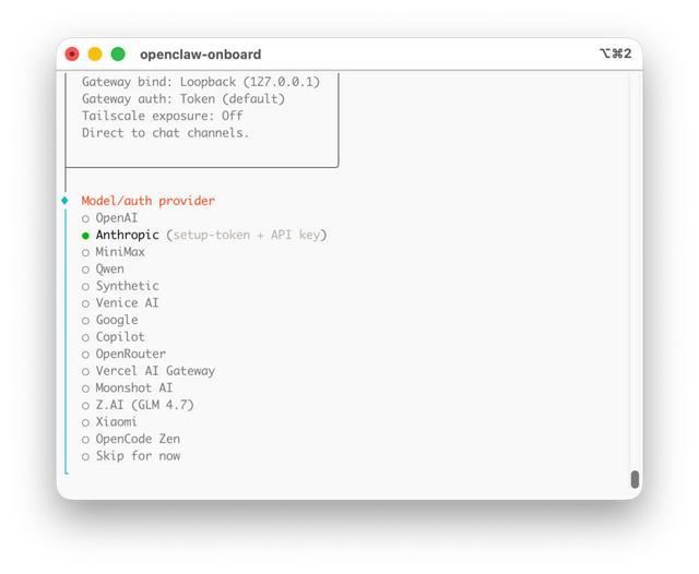 安装完成后,OpenClaw 会自动执行 openclaw onboard --install-daemon 指令来进行具体配置,一般情况下选择默认选项即可,而需要你具体配置的主要是四个部分: