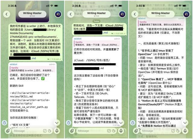 在 OpenClaw 上,我创建了一个写作专属的群组,来完成我的整个写作流程中 AI 协作的部分。在写作时,我会打开飞书的 Writing Master 群分屏放在左侧,把 iA Writer 的编辑窗口分屏放在右侧。