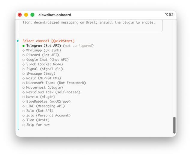第二个部分,配置与 OpenClaw 进行通信的 Channel。如果你选择了一些海外的即时通讯工具,那么在配置的过程中很容易出现问题,导致 Gateway 启动失败。这个时候,你有三个选择:1. 放任失败,先完成整个配置流程,稍后让 AI 来辅助你修正;2. 直接跳过 Channel 配置,先进入下一步;3. 选择一个国内的即时通讯工具,比如说飞书。