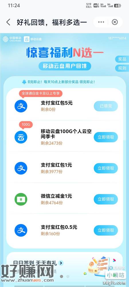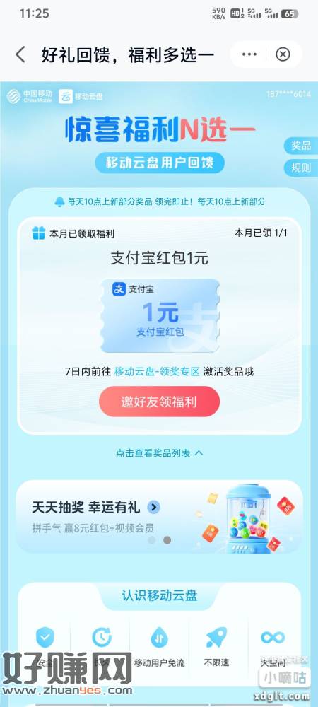 【中国移动云盘】云盘回馈奖品上新,月月登录可领:支付宝红包、立减金等好礼N选1,奖品每日上新,详情戳 https://c.139.com/m/a/s?p=08hk#19f4 查看,已领请忽略。拒收请回复R