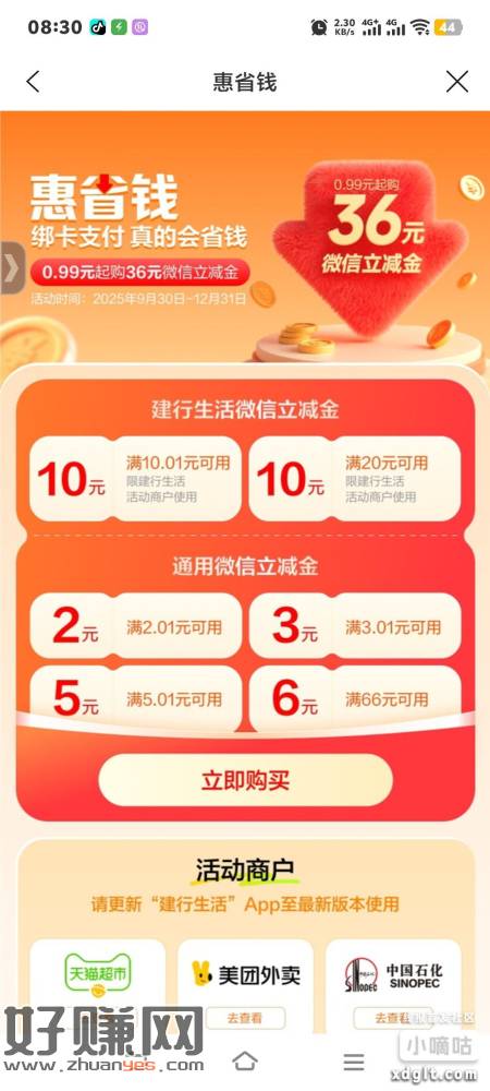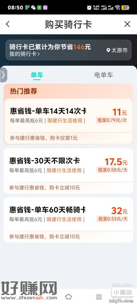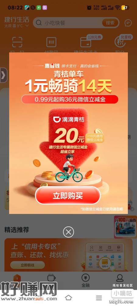 1元骑14天单车青桔单车,惠生活买立减金。用微信付:11-10=1。