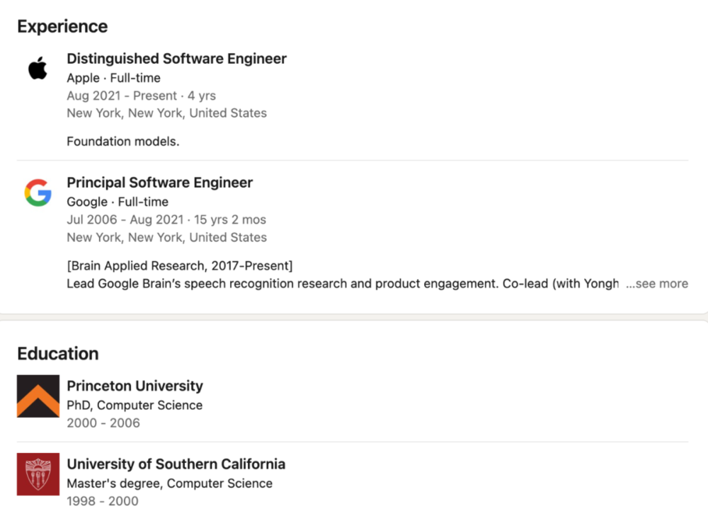 毕业后在 Google 工作约15年,参与大规模系统与基础设施开发,然后在 Apple 负责基础模型团队,管理百人规模工程体系。