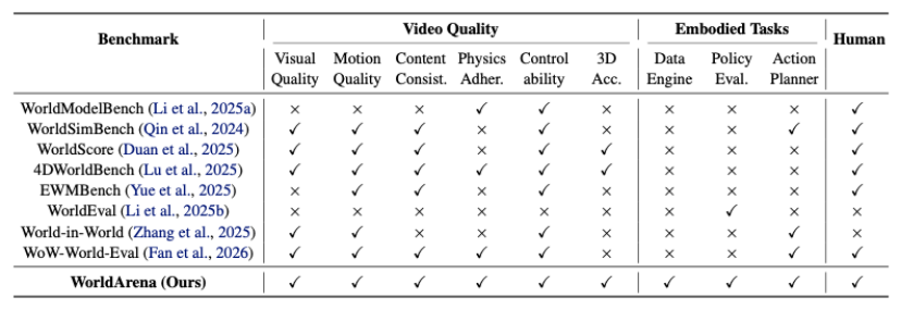 现有世界模型基准与 WorldArena 的评测维度对比:
