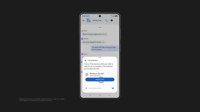 接下来的场景中,Gemini自动读取群聊内容,分析每个人的偏好,启动外卖应用,导航到对应餐厅,将所有披萨添加到购物车,最后生成订单等待用户确认。整个过程中,用户可以继续使用手机做其他事,也可以随时查看进度、介入调整或直接终止任务。