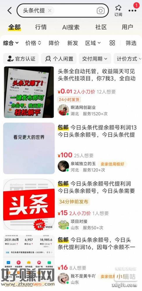 闲鱼上面搜今日头条余额号代提一个月可以做四次间隔7天每周星期四可以提现润10几或者20几,价格有高有低需要银行卡,买了他会给号你提现提现完必须Z.x,不然废了
