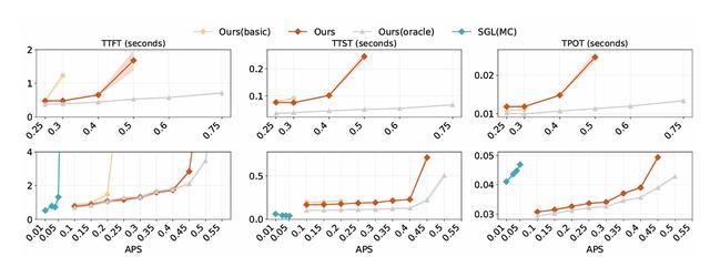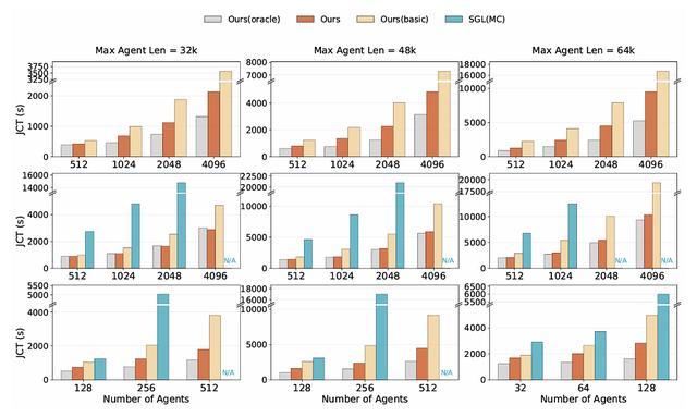在改变追加长度和生成长度时,DualPath在短token场景下优势更明显。随着追加长度增加,GPU计算压力增大,而生成长度增加则因预填充间隔变长,降低了KV缓存加载压力。