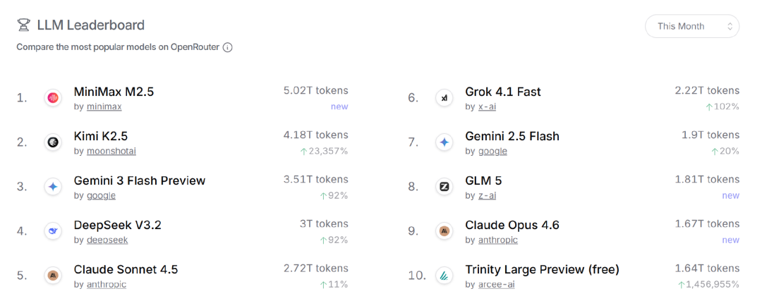 先从API说起,今年2月,Kimi K2.5模型成为海外市场调用量增长极为明显的一家。OpenRouter数据显示,该模型位于Tokens消耗第二的排名,环比增长23357%。