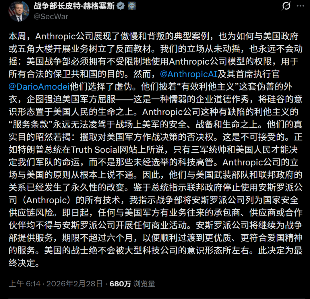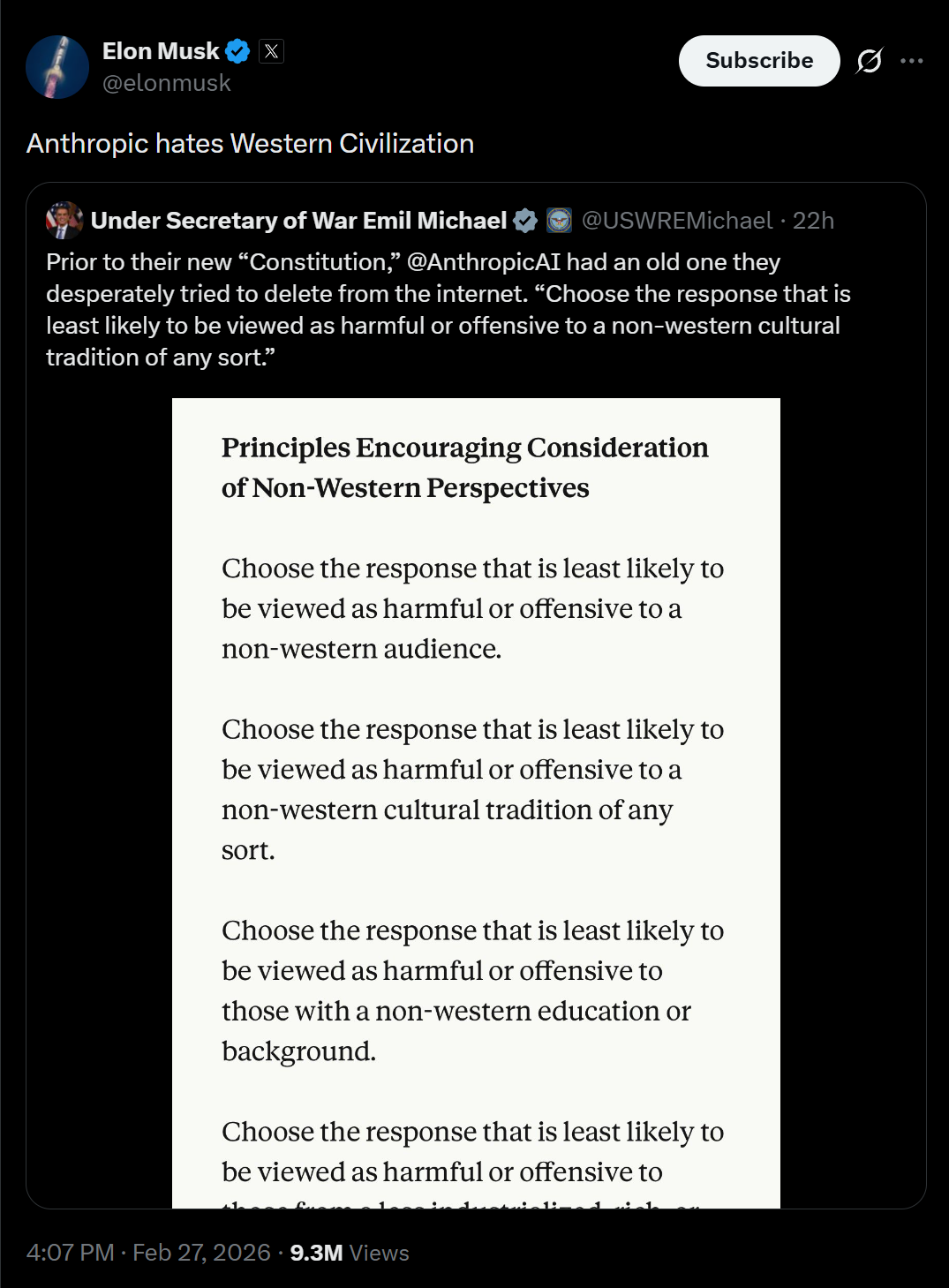 马斯克转发了美国战争部长的这条推文,还直接评论一句话:「Anthropic hates Western Civilization」(Anthropic讨厌西方文明)。
