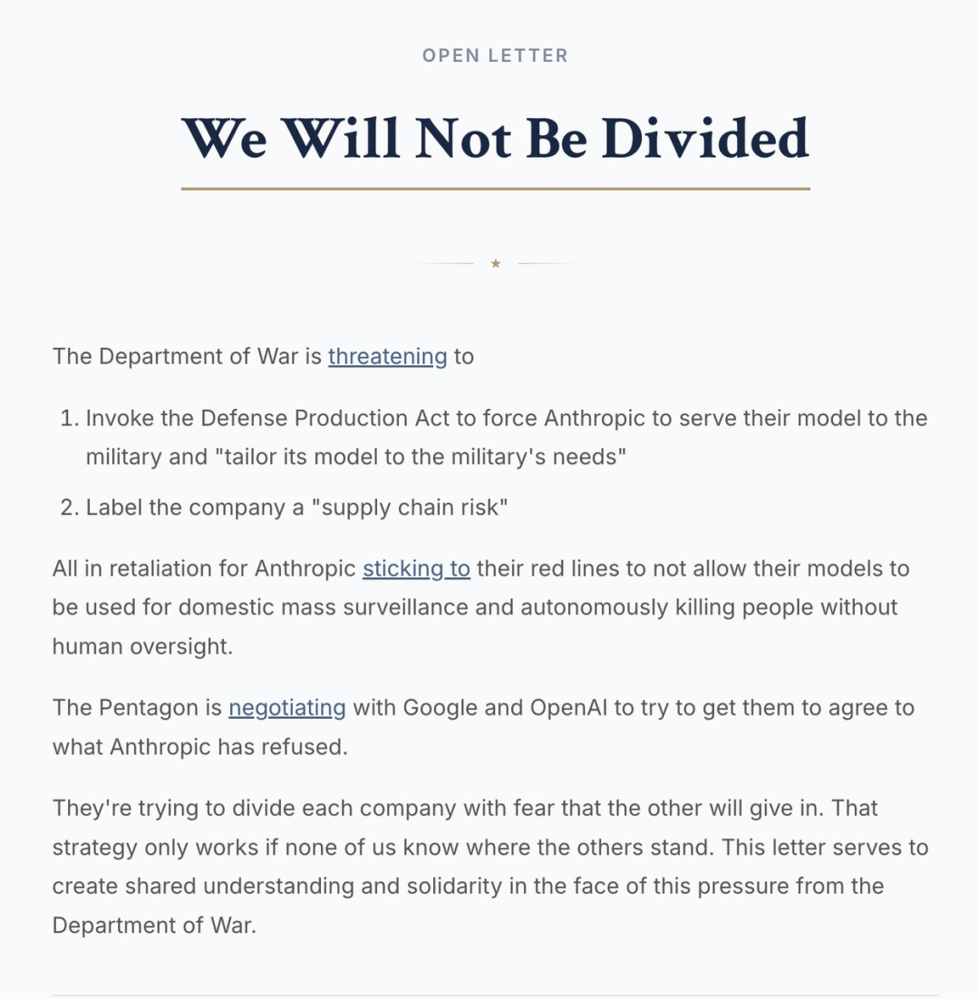 这份声明中,第一句话就亮了:「美利坚合众国绝不容许一家激进左翼、激进觉醒型企业来左右我们伟大军队的战斗与战争胜利方式!」