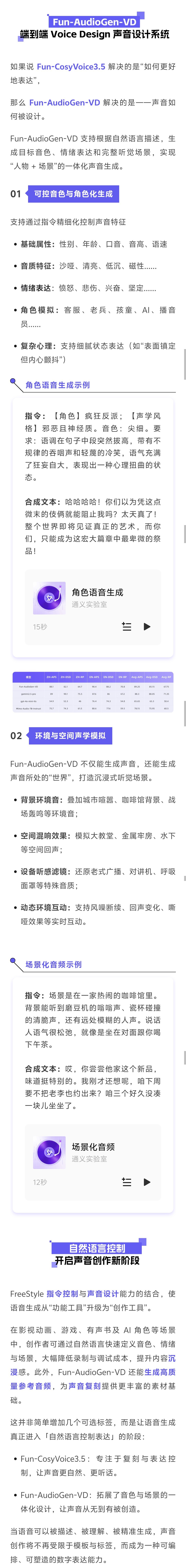 官方宣称,无论是精细控制声音表达,还是从零设计音色与场景,都可以通过自然语言指令直接生成。