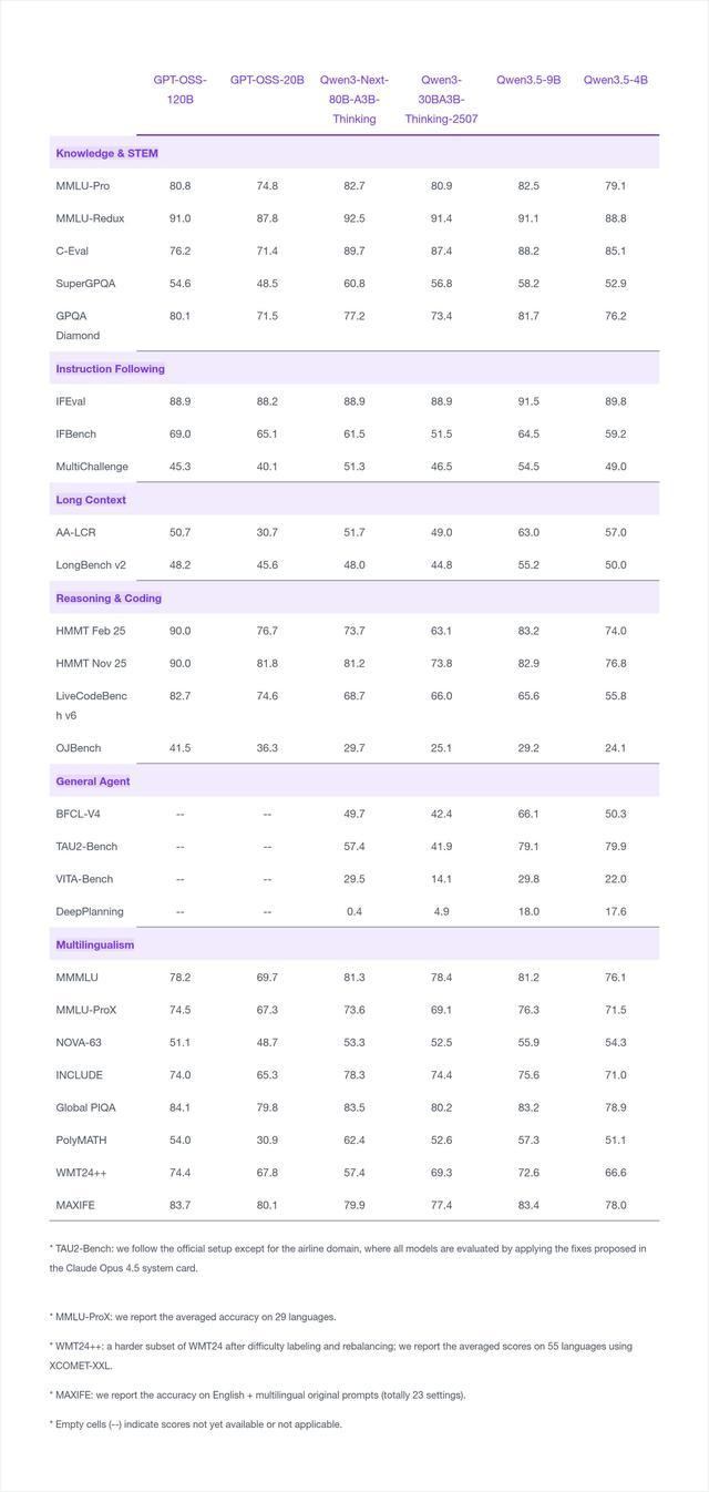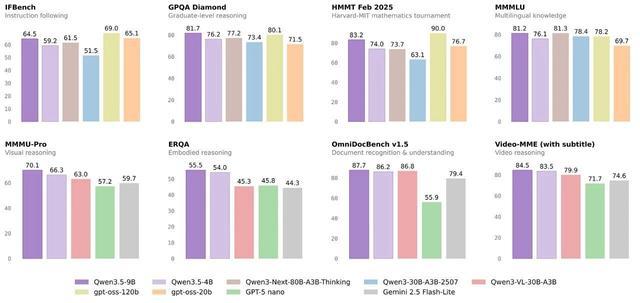 至此,千问 3.5 家族已开源 Qwen3.5-397B-A17B 的大尺寸模型,Qwen3.5-122-A10B、Qwen3.5-35B-A3B、Qwen3.5-27B 等 3 个中型尺寸模型,以及此次开源的 Qwen3.5-9B/4B/2B/0.8B 的 4 款小尺寸模型。
