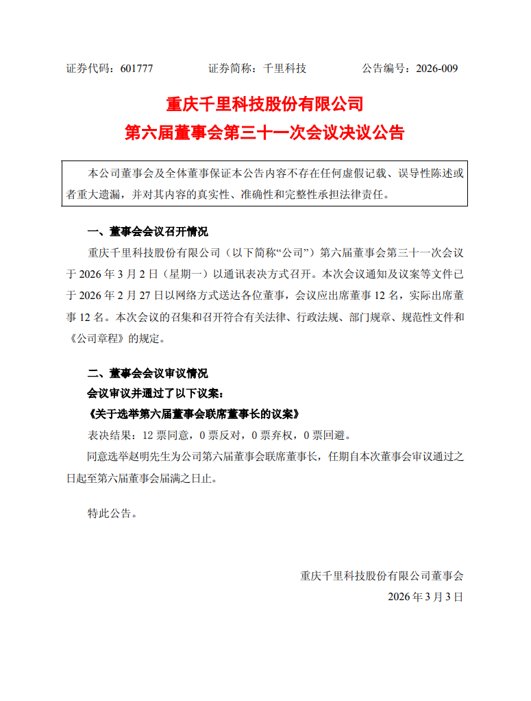 凤凰科技讯 3月4日,千里科技发布公告,称召开第六届董事会第三十一次会议。在此次会议上,同意选举荣耀前CEO赵明为公司第六届董事会联席董事长,任期自本次董事会审议通过之日起至第六届董事会届满之日止。