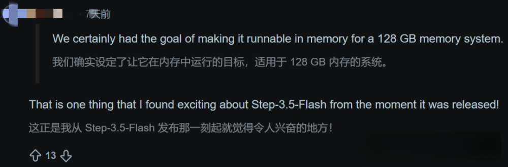 阶跃星辰CTO朱亦博回复称,团队的确有明确目标,即让相关模型能够运行在128GB内存系统中。他发现,目前市场上约230B规模的模型,刚好超出了其个人MacBook Pro设备4位量化的承受范围,因此他便要求团队对模型规模进行了适当缩减。