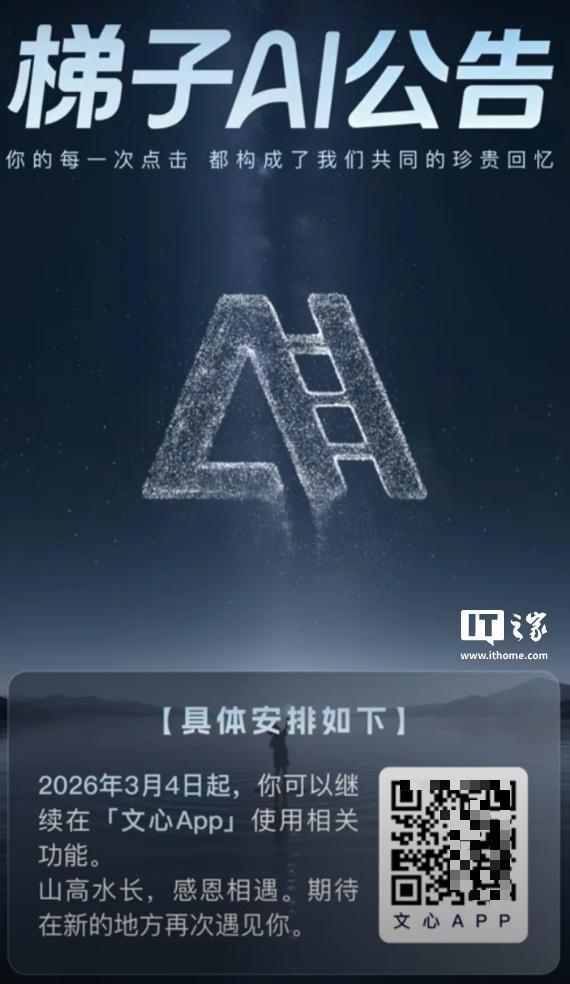 而在上线约半年后的今天,官方发布公告,称该产品正式停运,用户可以继续在文心 App 中使用相关功能。截至IT之家发稿,“梯子 AI”的官网已下线,App 也已从各大应用市场下架。