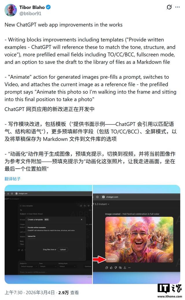 在多媒体生成领域,新版还将简化图像转视频的操作流程。泄露信息显示,AI 生成的图像下方将新增一个“动画化”按钮。