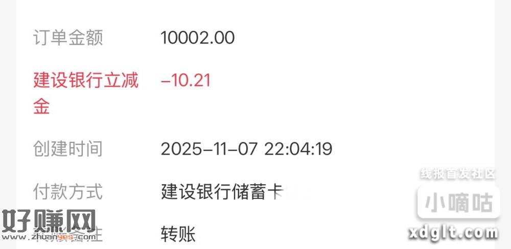 zfb,建行卡,转账,有立减,1w减10块,转了3次,都有