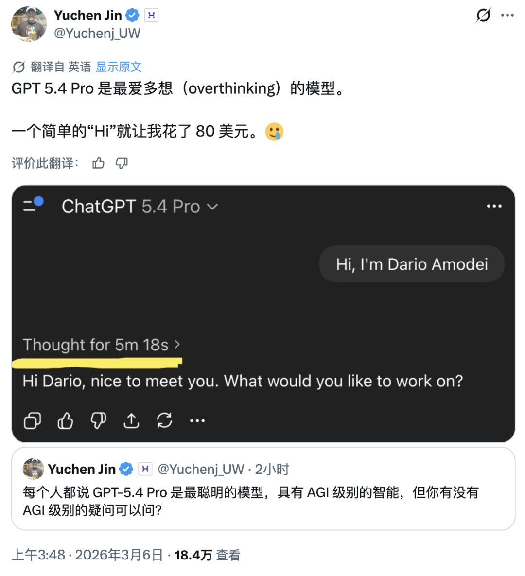当然,强大的推理能力也有它的另一面。Hyperbolic 联合创始人金宇晨在 X 平台吐槽,GPT-5.4 Pro 是他用过最爱「过度思考」的模型——仅仅发了一句简单的「Hi」,模型就开始认真推理,直接烧掉了 80 美元。