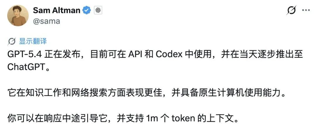 OpenAI CEO 山姆·奥特曼也在 X 平台发了一条简短推文,点出了五个方向:知识工作更强、网页搜索更出色、原生计算机操控、支持百万 Token 上下文、响应过程中随时可介入。