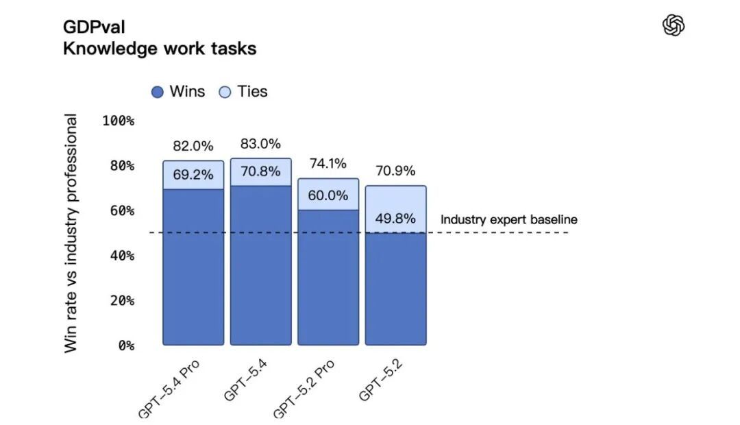 GPT-5.4 的答案是 83.0%,意味着十次对比中有八次以上,行业专业人士认为 AI 的产出达到或超过了人类同行水准。上代 GPT-5.2 是 70.9%,差距将近 13 个百分点。