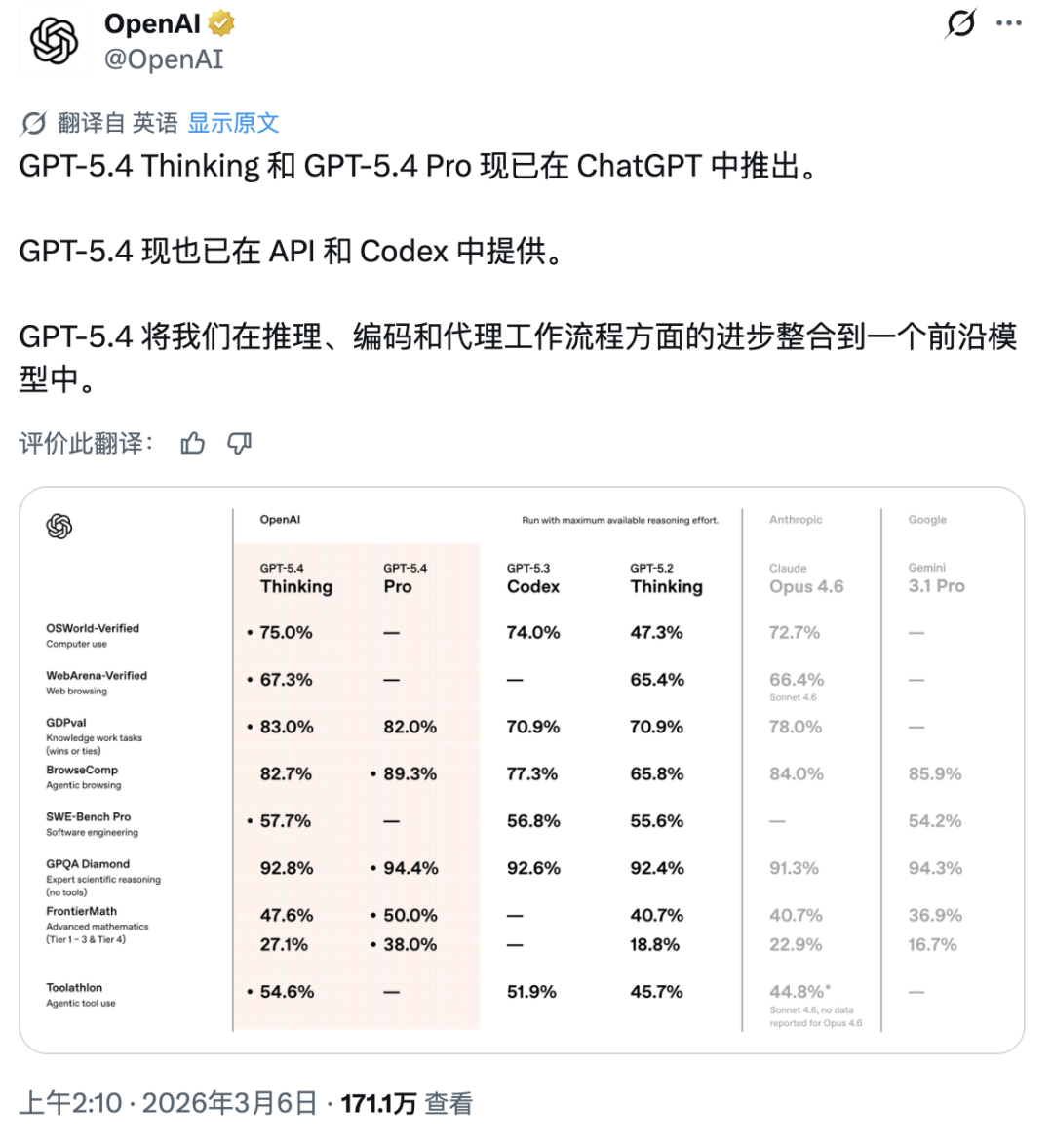 就在刚刚,OpenAI 正式发布 GPT-5.4,把编程、推理、计算机操控、网页搜索和百万 Token 上下文全部整合进同一个模型,且没有为了整合而牺牲任何一项的能力。