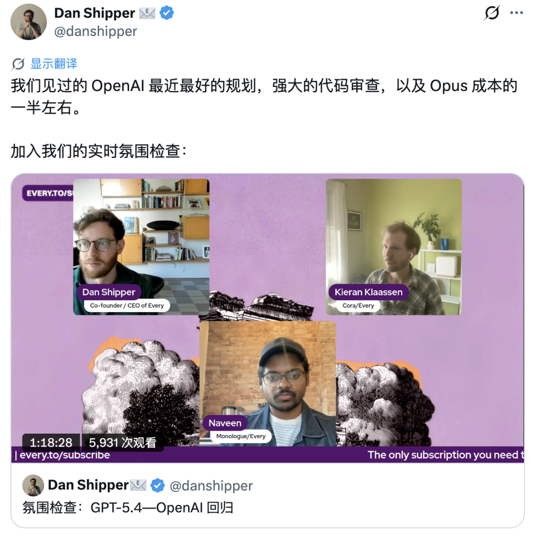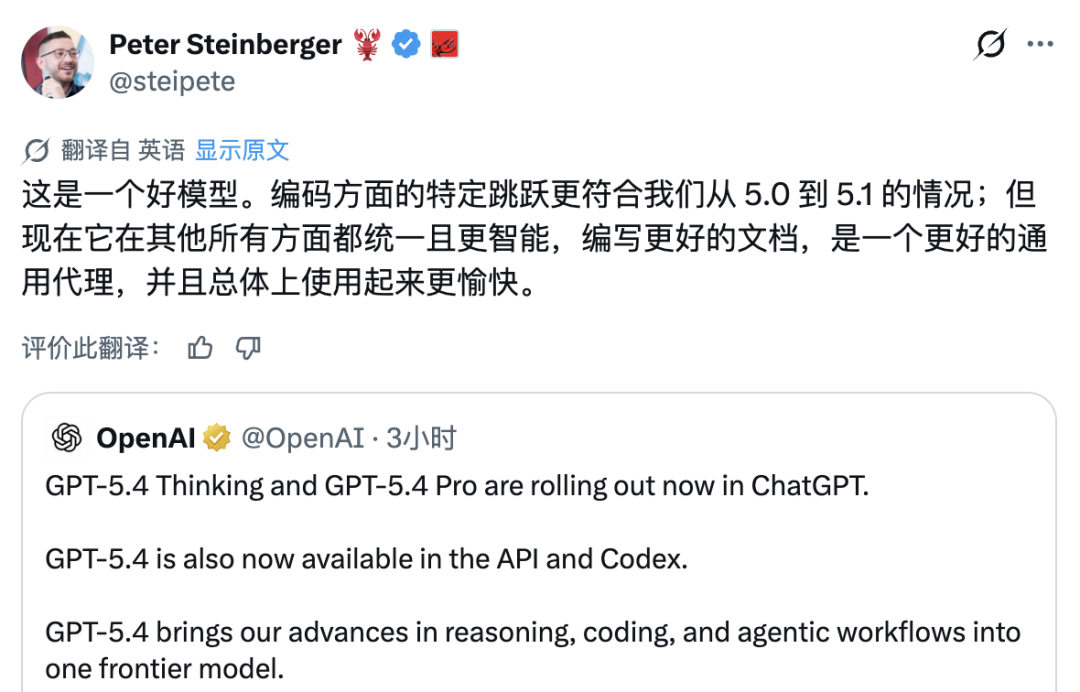 他点出了两个具体维度。其一,规划能力是长任务成败的关键,GPT-5.4 在任务拆解和持续推进上明显更有条理。其二,与 Claude Opus 相比约一半的成本,对需要大规模 API 调用的开发者来说,这个差距在账单上会非常直观。
