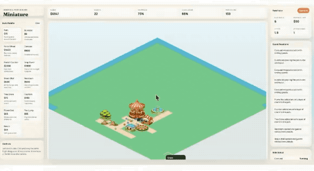 OpenAI 展示了一个典型案例:仅凭一条轻量提示词,GPT-5.4 生成了一个完整的等距视角主题公园模拟游戏,涵盖基于瓦片的路径铺设与景点建设系统、游客 AI 寻路与排队行为,以及资金、游客数、满意度、清洁度四项指标全部实时动态更新的综合评分。
