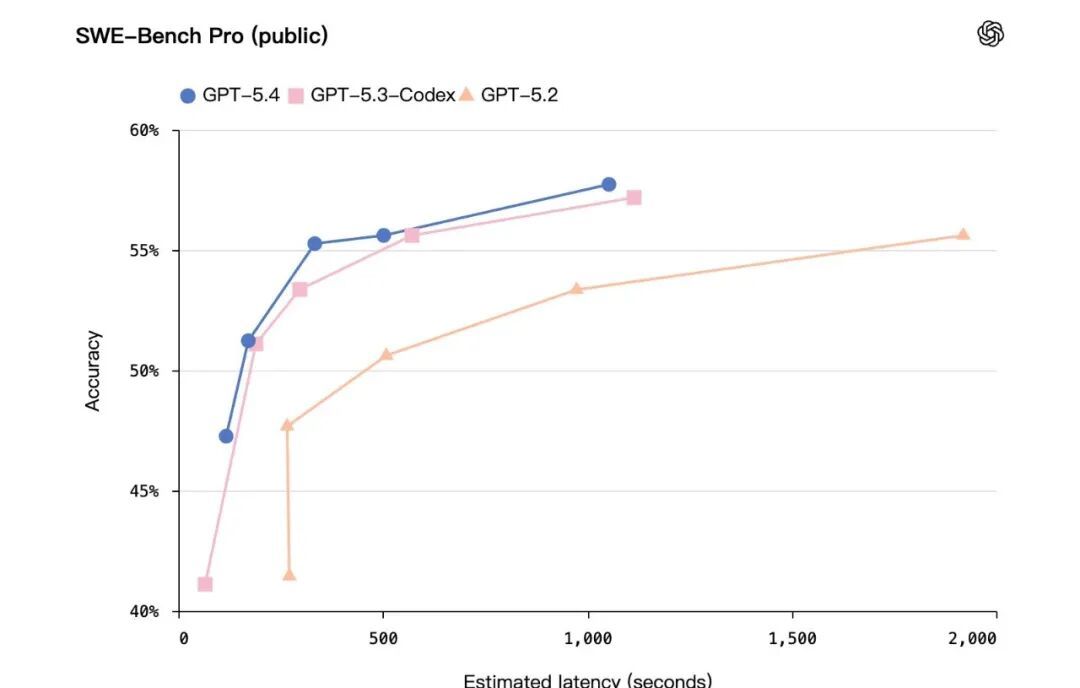 SWE-Bench Pro 专门测试真实软件工程任务,GPT-5.4 得分 57.7%,GPT-5.3-Codex 是 56.8%,GPT-5.2 是 55.6%。整合之后,编程分数不降反升,同时还顺带获得了计算机操控等一整套通用能力,几乎找不到明显的弱点。