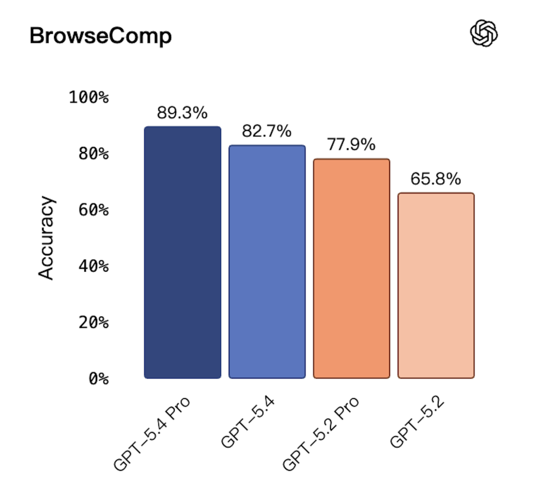 网页搜索方面,GPT-5.4 在 BrowseComp 基准上得分 82.7%,比 GPT-5.2 的 65.8% 高出 17 个百分点,Pro 版更达到 89.3%,创下业界最高分。Zapier CEO 评价说,GPT-5.4 会在其他模型放弃的地方继续搜索下去,是他们测试过持续性最强的模型。