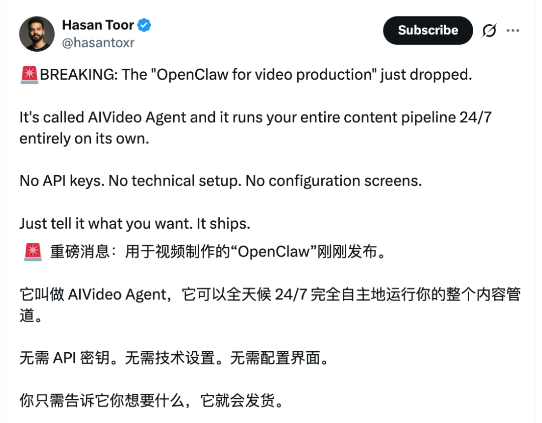 刚刚,X上有网友分享了一个用于视频制作的“Open Claw”,名叫AIVideo Agent,打开了龙虾的新玩法。
