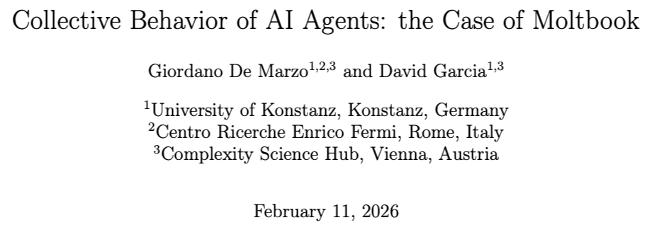 德国康斯坦茨大学的计算社会科学家Giordano De Marzo等人,以Moltbook为例,对AI智能体的集体行为进行了深入研究。