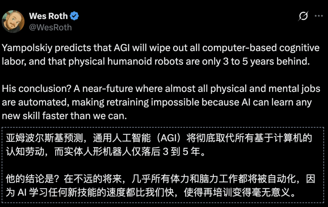 通用人工智能(AGI)将彻底取代所有基于计算机的认知劳动,而实体人形机器人仅落后3到5年。